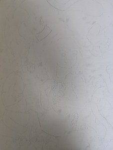 With some tracing paper, a pair of scissors and ample floor space, I got to work making adjustments to my composition. Satisfied with the new positions, it was time to transfer. Another feat accomplished thanks to tracing paper. I make sure to put only the main lines down. They are fairly light on the canvas, and serve as a guide for the initial layers of colour.