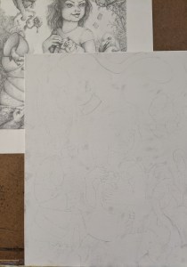 I did some quick sketches to figure out my version of the Cheshire cat and some studies of a few other bits and pieces, but that was pretty much it. My preparation for Alice was a lot of thinking and three pages of scribbling.
