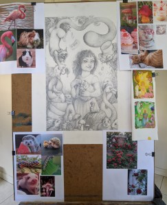 With the sketch done, it’s time to prepare the canvas for painting. Word of wisdom, buy the canvas before deciding on what size to make your sketch. I, of course, did not work with this sort of wisdom and alas, when I went canvas buying, could not get the exact dimensions that I needed. The best canvas I could find was a little wider than the sketch, but not quite as tall.